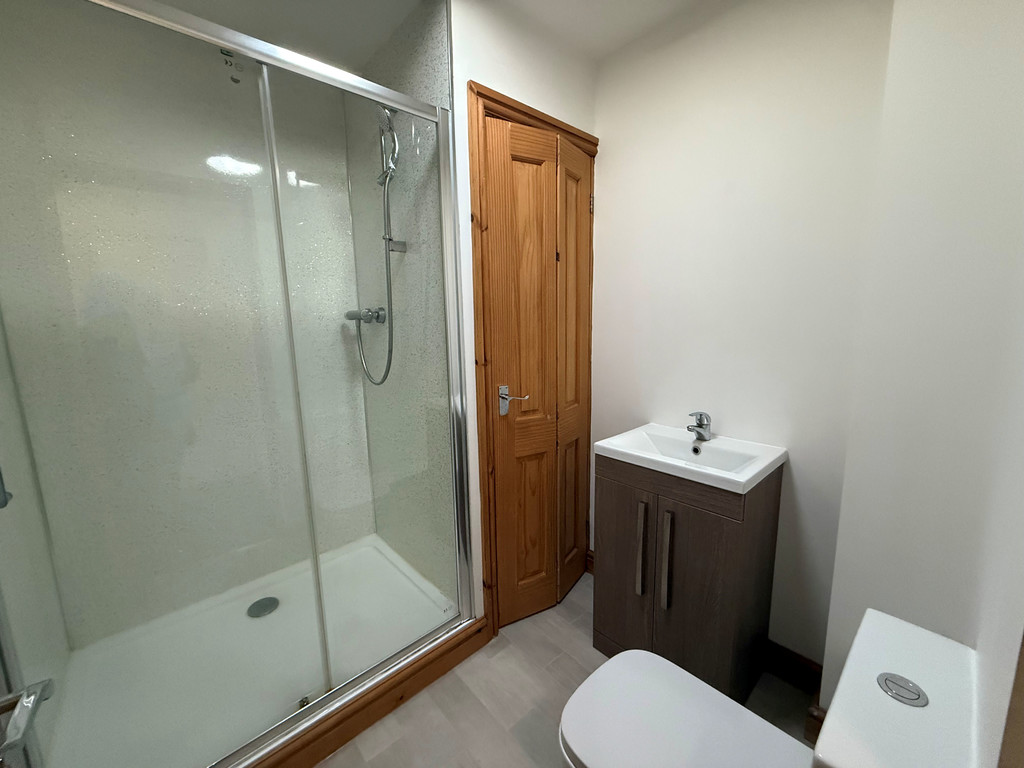 Inside, you'll find a spacious double bedroom, providing plenty of room for a bed and additional furnishings. The three-piece bathroom includes a shower, toilet, and sink, offering a clean and functional space.