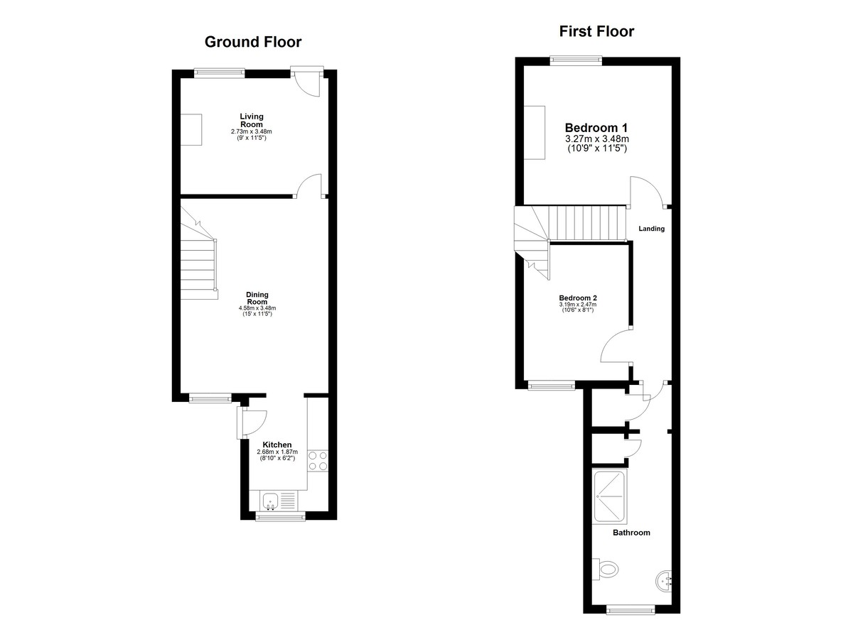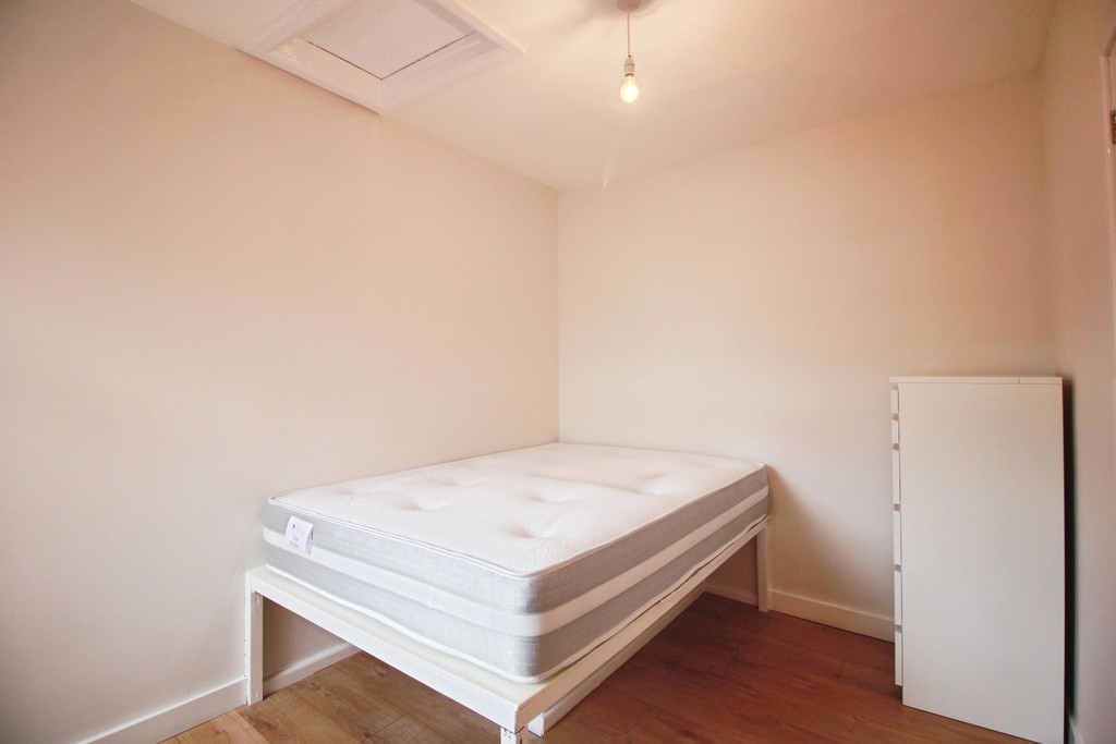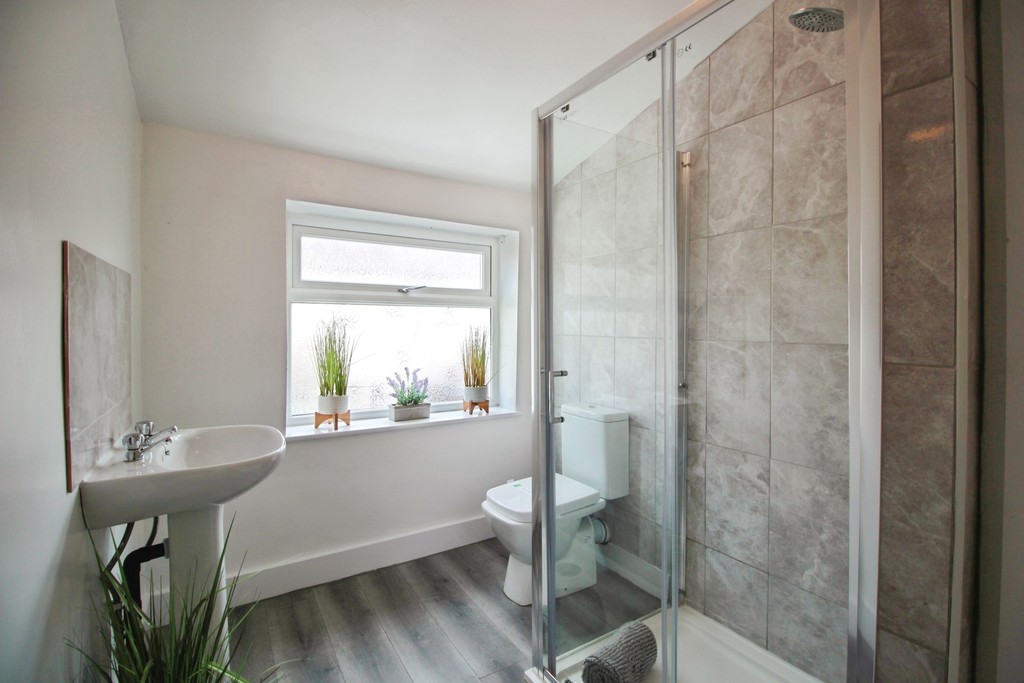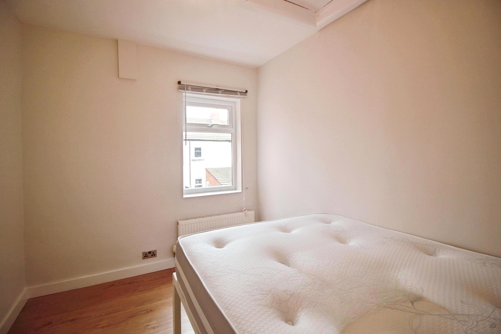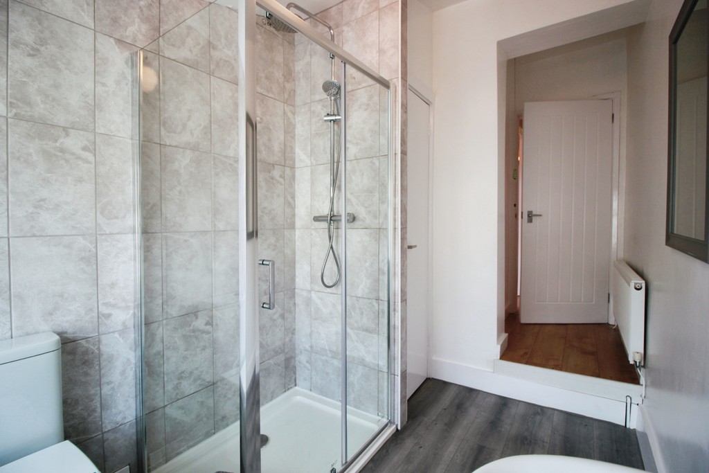 To the first floor, the property offers a spacious master bedroom spanning the full width of the house, furnished with a wardrobe and chest of drawers. The second bedroom is also a good-sized double, complete with a chest of drawers. The accommodation is completed by a modern bathroom featuring a WC, sink, and large shower.