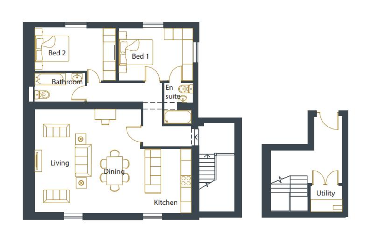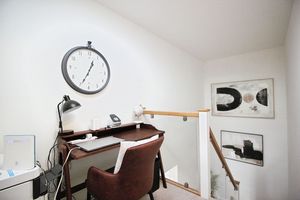 Upon entering the property, you are welcomed by a spacious hallway featuring a useful utility cupboard and ample storage. Stairs lead to the first floor, where you will find a versatile office space - ideal for home working. A further short staircase leads to an impressive open-plan kitchen and living area, boasting high ceilings and large windows that flood the space with natural light, creating a bright and airy atmosphere.