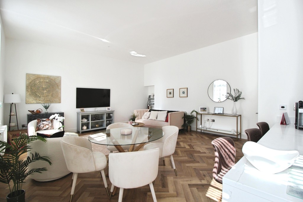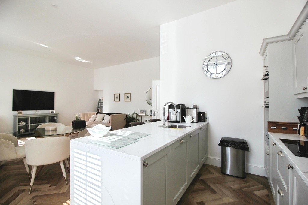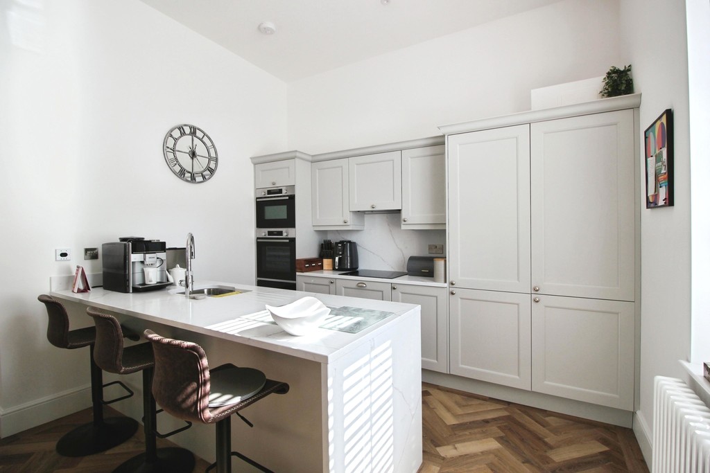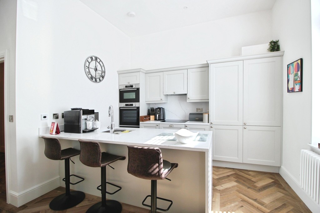 The modern kitchen is finished to a high standard and comes fully equipped with integrated appliances, including a fridge/freezer, dishwasher, cooker, and hob.