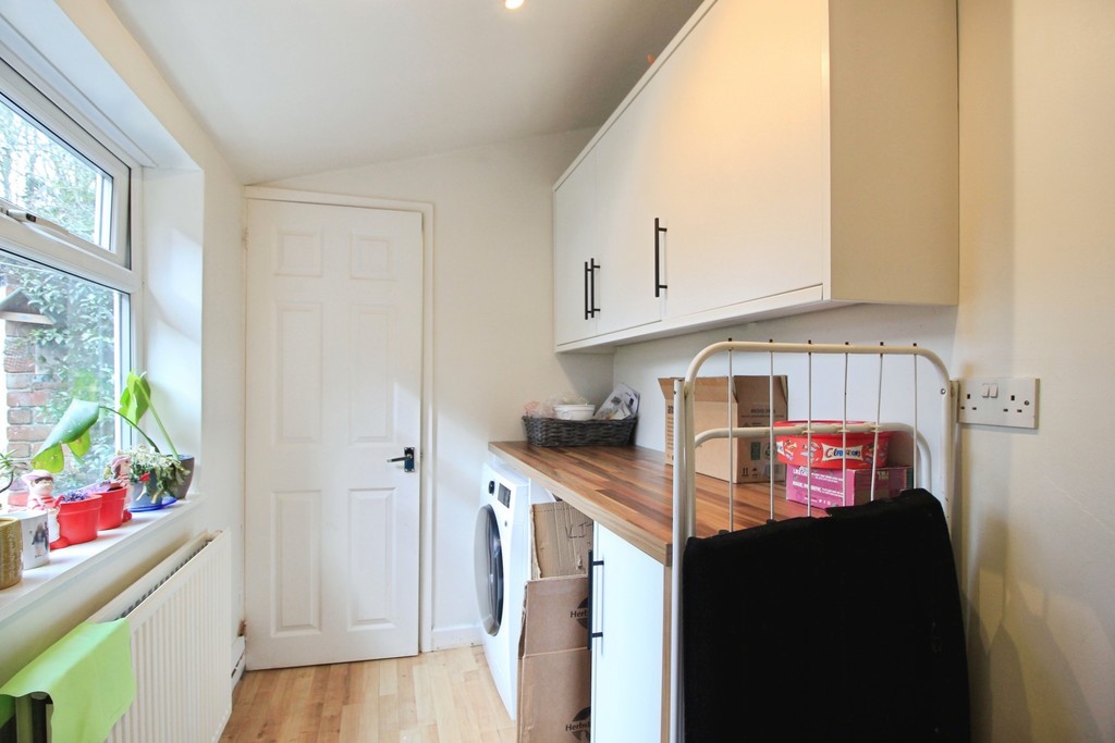 To the rear, the property boasts a modern open-plan kitchen, fully equipped with a dishwasher and fridge/freezer, offering both practicality and style. This leads through to a useful utility area with a washing machine and further access to a convenient downstairs WC.
