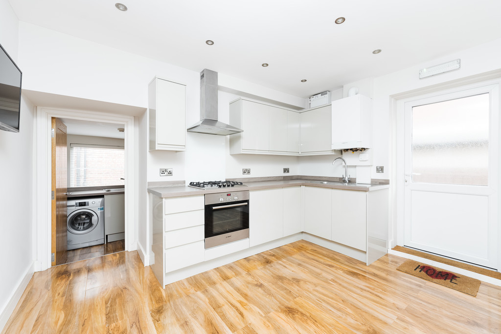 The kitchen, which is one of the highlights of the property is tastefully fitted with contemporary style grey gloss fronted units and drawers and gloss walnut flooring. There is an integrated dishwasher, four ring Bosch gas hob, glass splash back, stainless steel hood, Bosch electric oven/grill, and a 1.5 bowl stainless steel single drainer sink unit with contemporary style mixer tap. The light and airy kitchen has ample space for a dining table with a door leading to a separate good size utility room. An external door leads to a private roof terrace that offers a fantastic relaxation space.