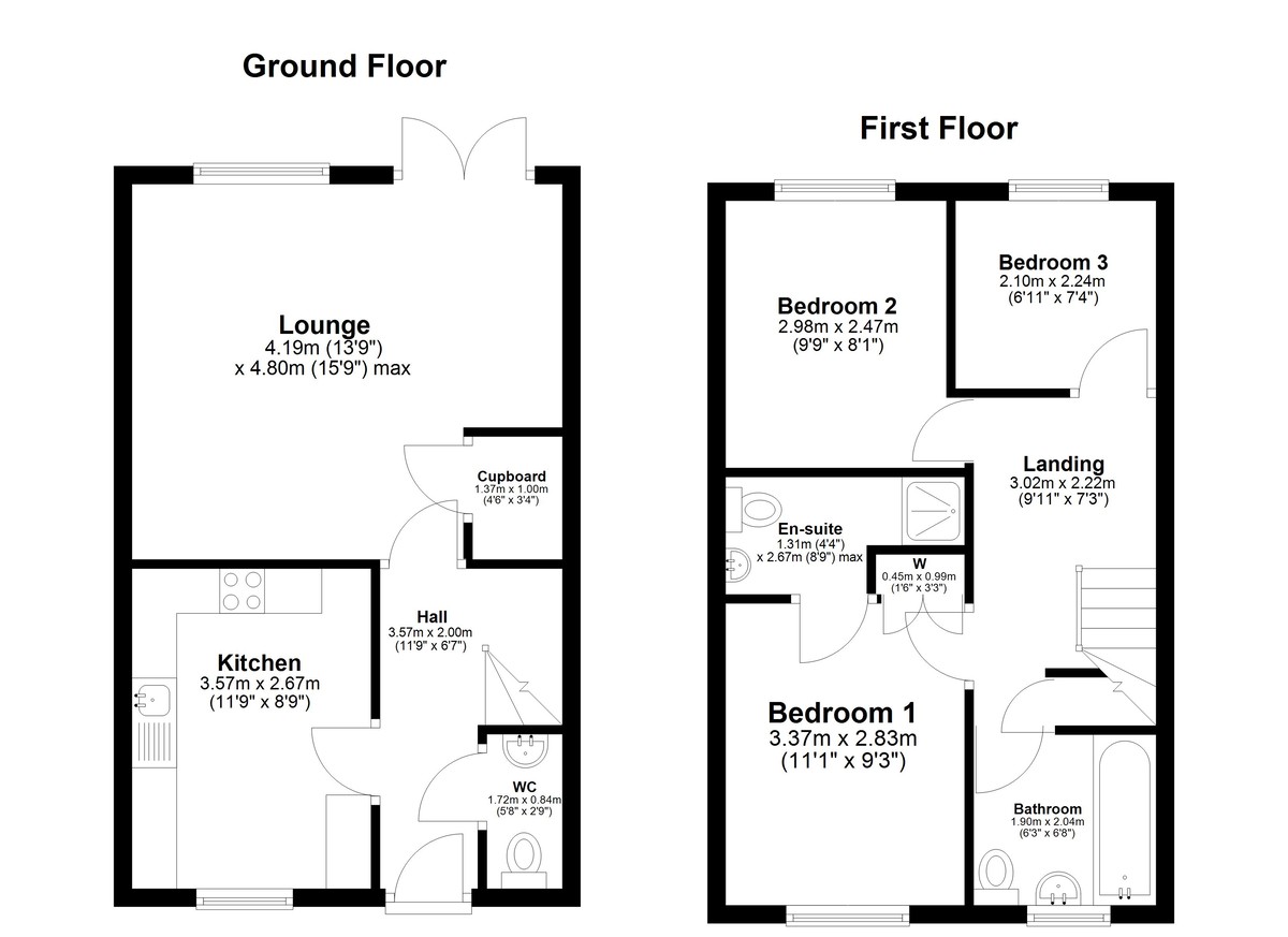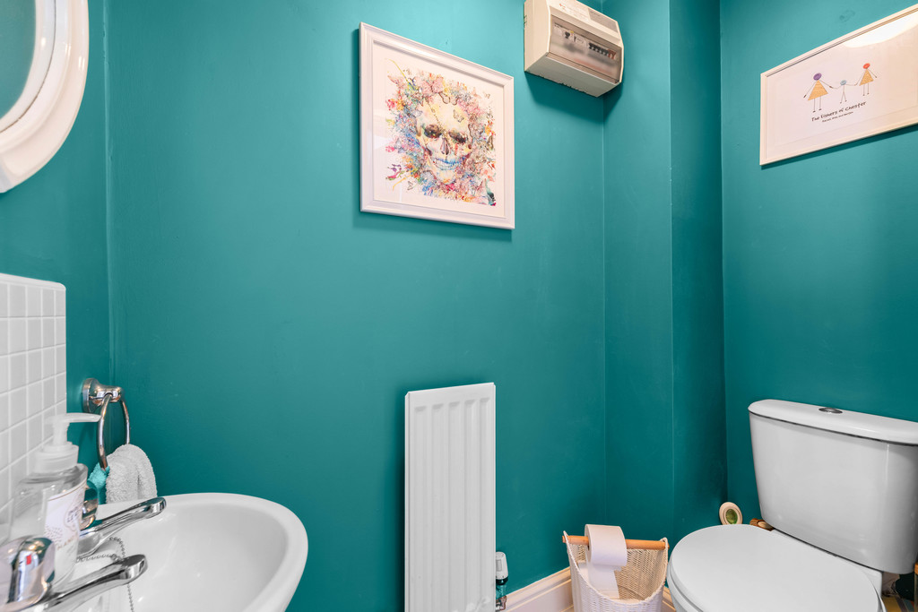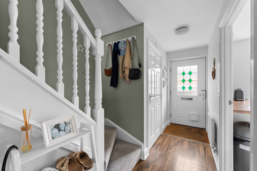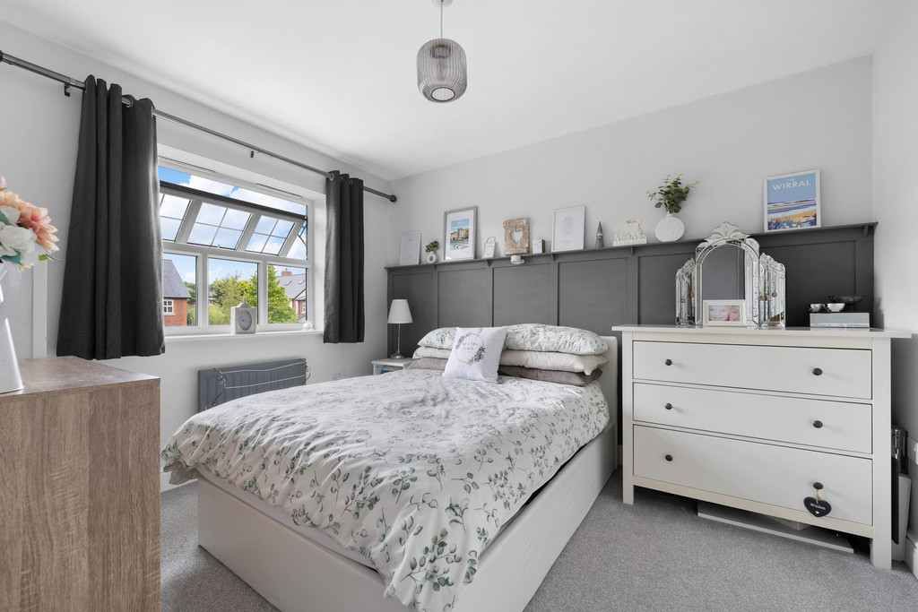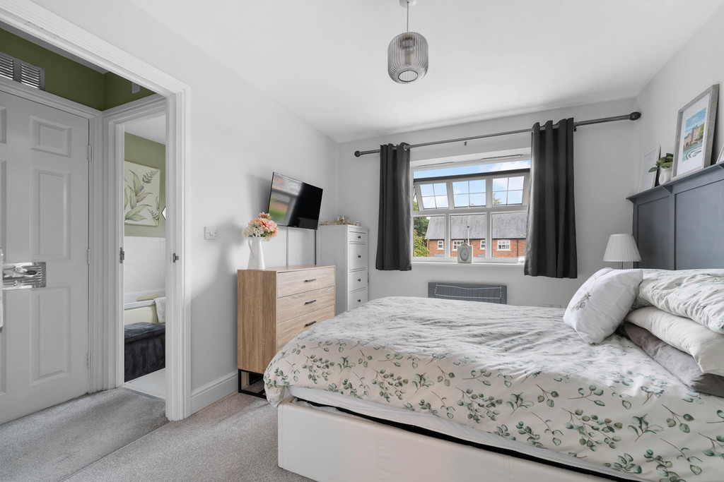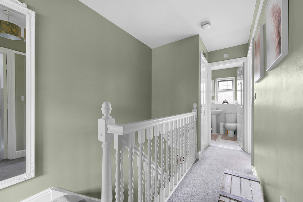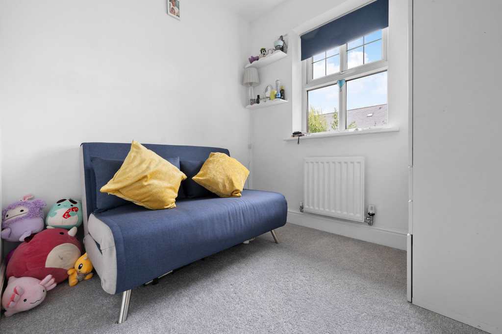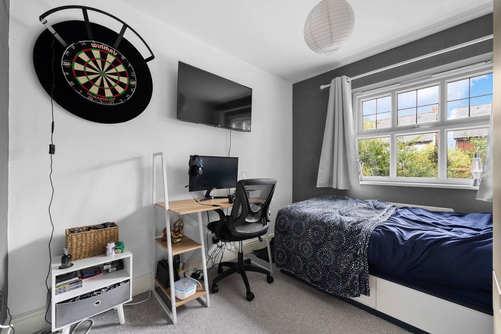 Upstairs, the landing - decorated in soft sage green tones - connects three well-proportioned bedrooms and the main bathroom. The master bedroom comfortably accommodates a double bed and features a stylish panelled wall, a large window, and a modern ensuite shower room. The second bedroom also offers space for a double, with contemporary styling and plenty of natural light. The third bedroom is larger than average, lending itself perfectly to use as a nursery, study, or home office, depending on individual needs.