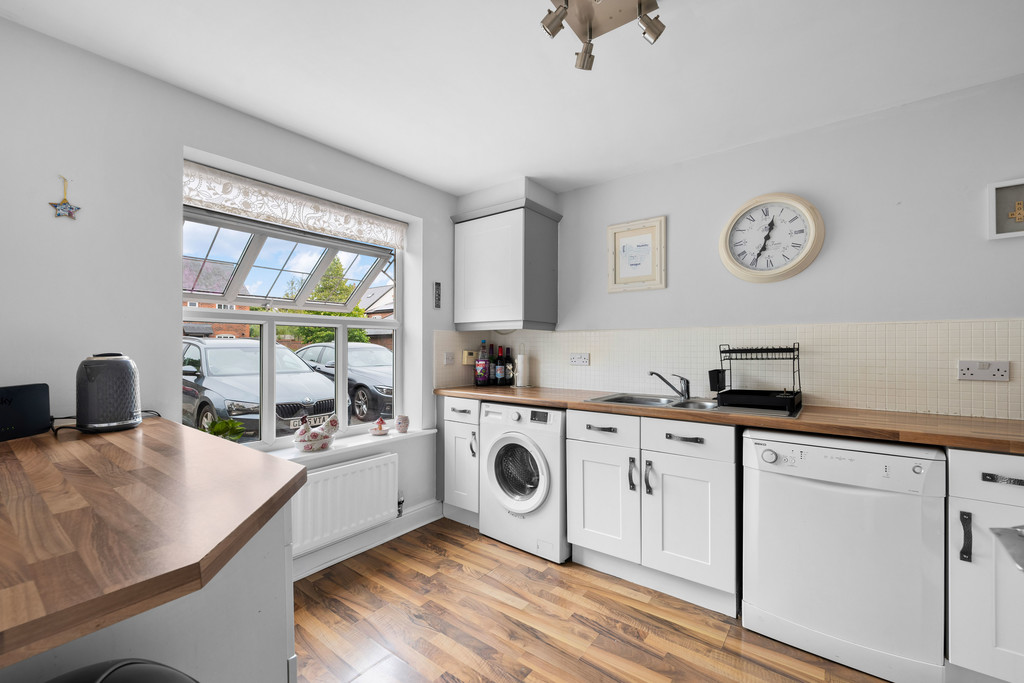 The property opens with a bright and welcoming hallway, finished with wood-effect flooring and light décor, creating an immediate sense of space. From here, you are led to the modern kitchen/breakfast room, fitted with a range of sleek white units, integrated oven and hob, and ample space for further appliances. A large front-facing window fills the room with natural light, providing a pleasant setting for everyday cooking and dining. A neatly presented WC completes the front of the ground floor.