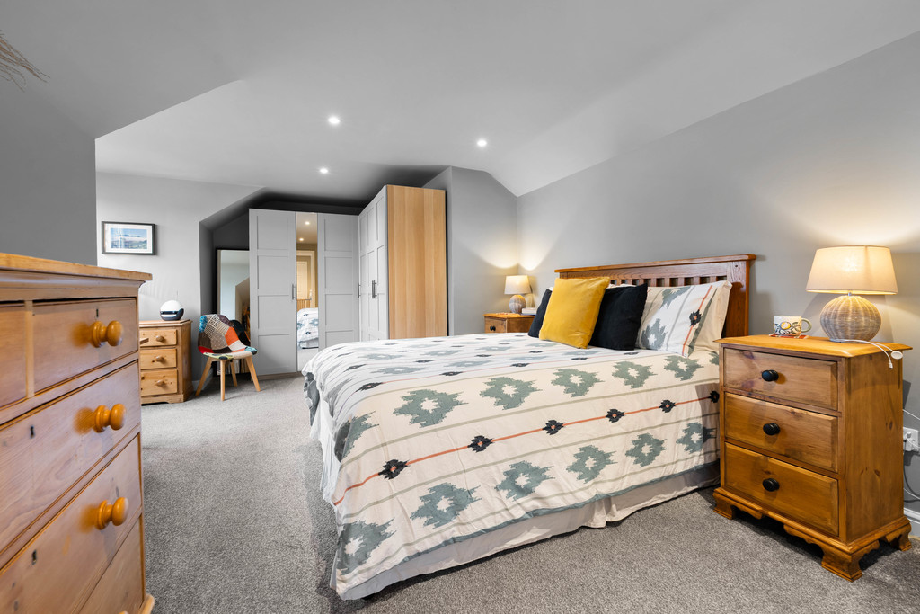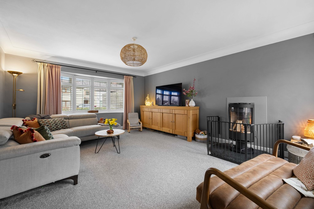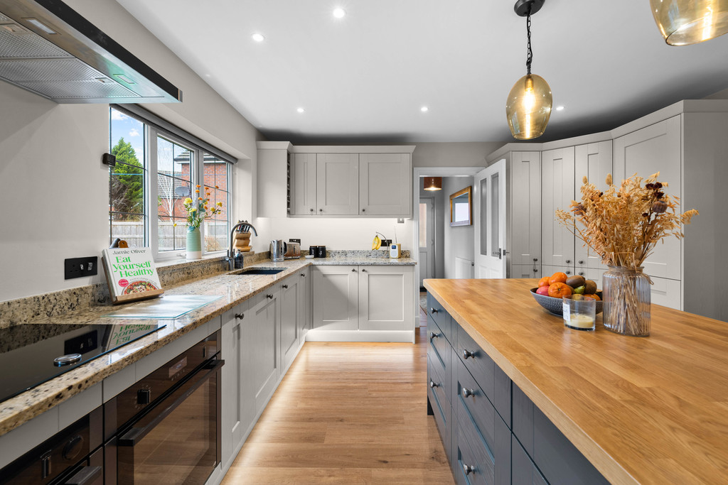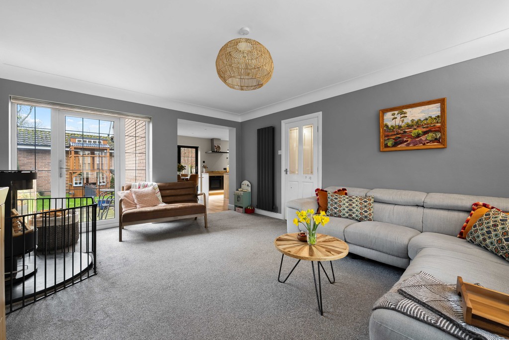 Complementing the open-plan space is a generous living room, providing a comfortable and quieter retreat that is complete with a log burning stove and garden access.
