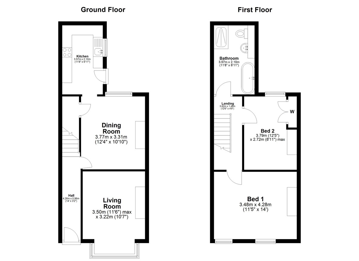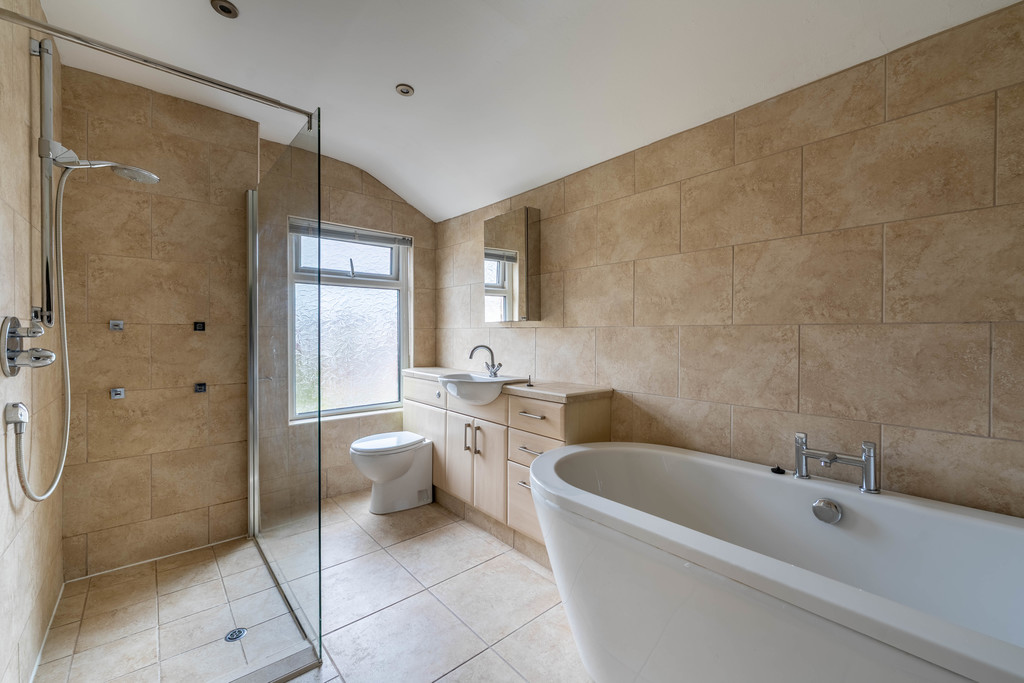 Upstairs, the property offers two well-sized double bedrooms. The principal bedroom is particularly spacious, while the second bedroom is also a comfortable double with built-in storage. A large family bathroom completes the first floor, featuring a freestanding bath and separate walk-in shower.