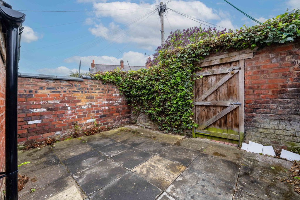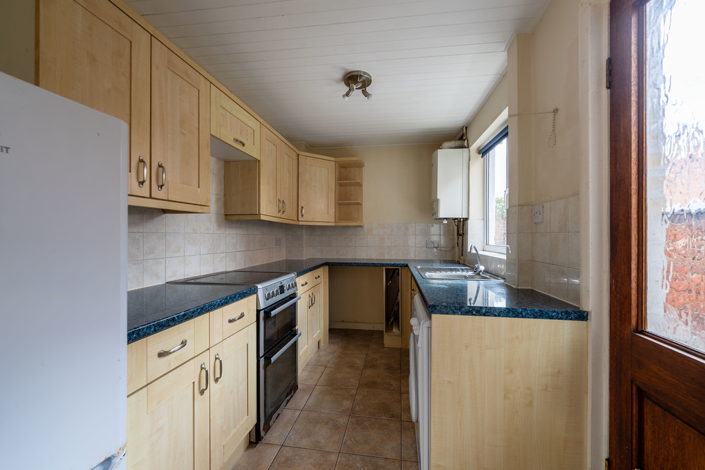 The kitchen is fitted with a range of units and work surfaces, offering a practical layout with scope for modernisation. A door leads out to the enclosed rear courtyard, which provides a low-maintenance outdoor space with brick-built storage and rear access.