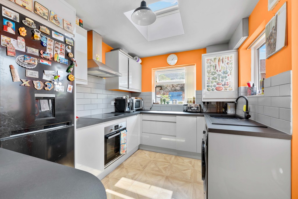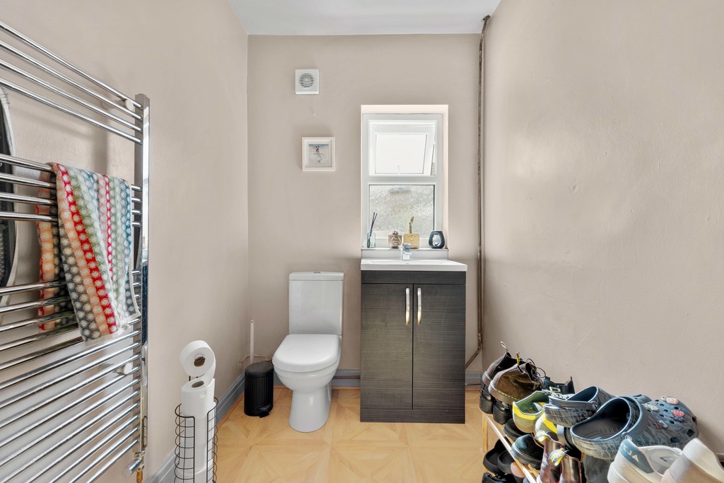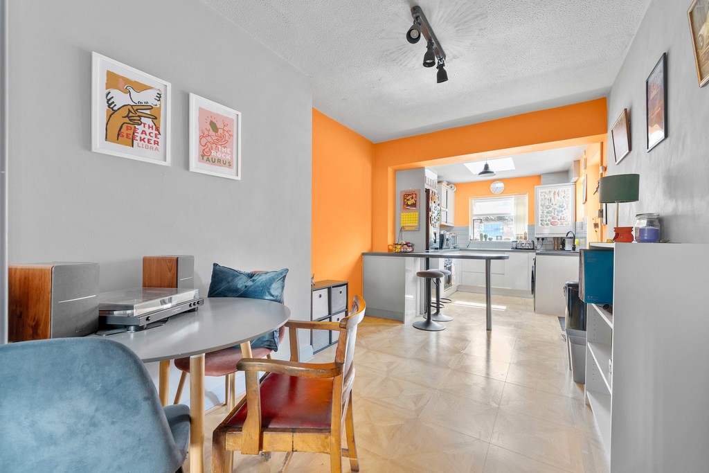 The ground floor begins with a entrance hall leading to a spacious and airy front reception room, which flows seamlessly into the dining area, creating a wonderful open-plan feel. To the rear is a modern fitted kitchen, complete with a breakfast bar, induction hob, electric oven, and space for a fridge freezer and washing machine. A generous downstairs WC and useful understairs storage complete the ground floor.