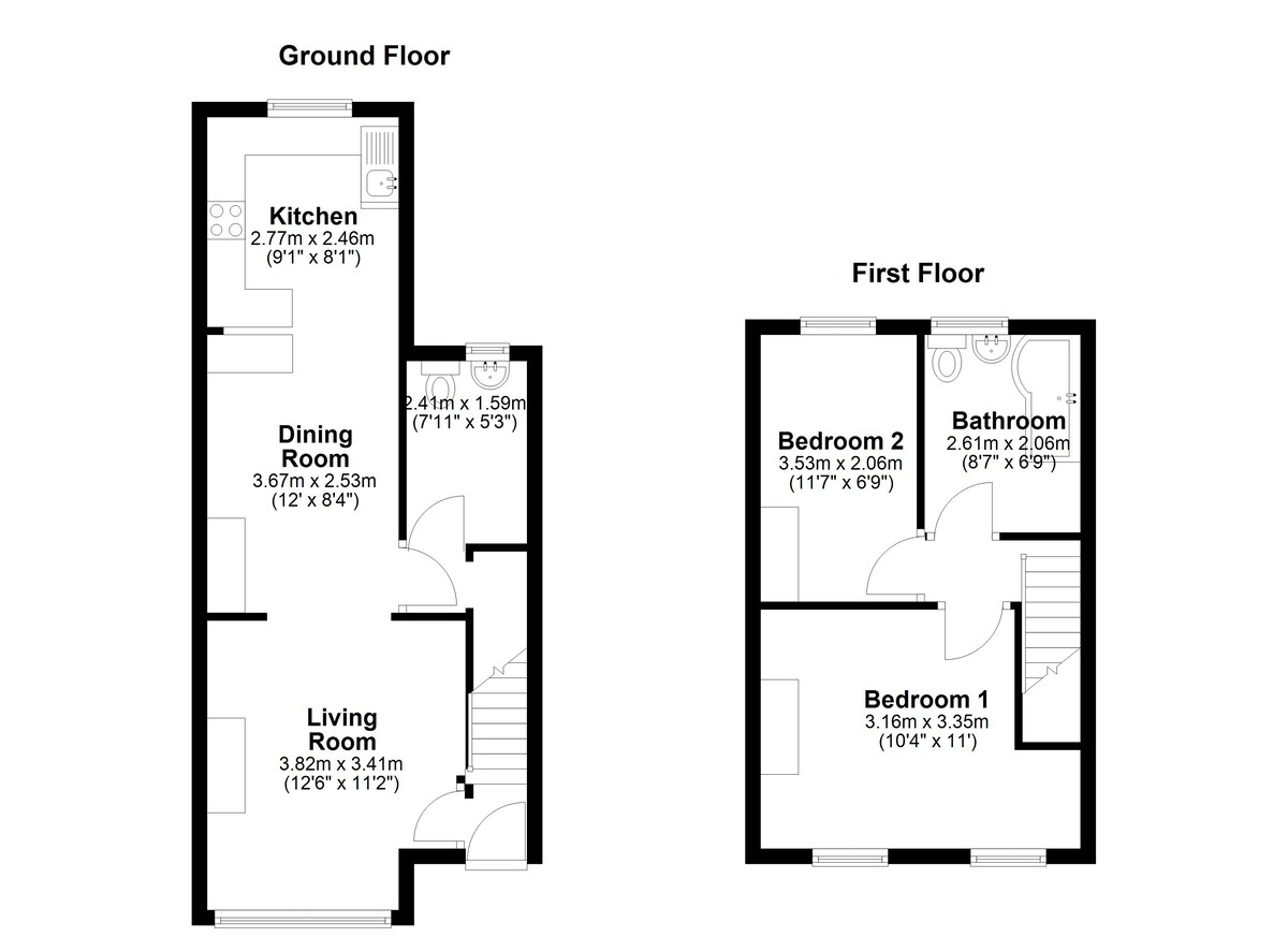 Upstairs, the home offers two well-proportioned bedrooms. The main bedroom spans the full width of the house, providing a particularly impressive and versatile space. The second bedroom is also a comfortable double, and both are served by a stylish bathroom featuring a vanity sink, WC, and a P-shaped bath with rainfall shower above.