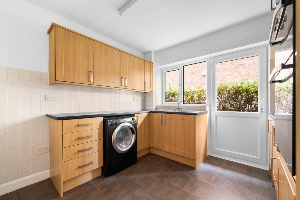 The Shaker-style kitchen is well presented, offering ample storage and workspace, with a rear door leading directly to the garden for convenient outdoor access.
