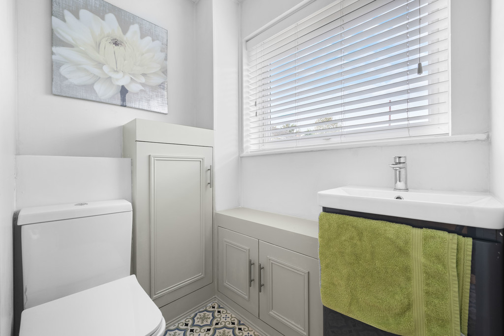Leading up to the first floor via a U-shaped staircase, the master bedroom is to the rear of the property overlooking the garden. It is a spacious room with a large window. Bedroom two, to the front of the property, is another good-sized double with a fitted storage cupboard. Bedroom three, to the rear of the house can accommodate a double bed if required. The three bedrooms are served by a white, three-piece bathroom suite.