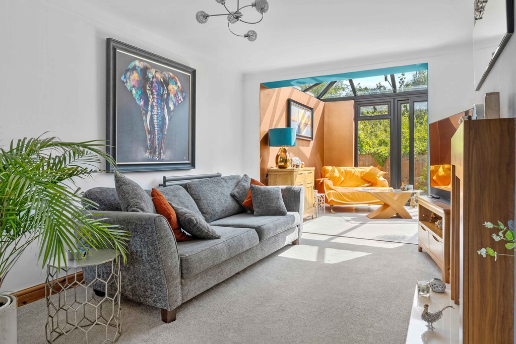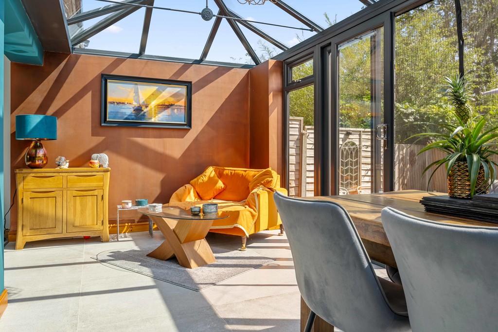 The property is set back from the lane with a walled front garden, providing fantastic kerb appeal. The front door opens into a spacious hallway, featuring two useful storage cupboards to hide away shoes and coats, opposite the recently fitted downstairs toilet, which also houses the energy-efficient combi boiler that was fitted in January 2024, neatly hidden in a ready-made cupboard. Moving through to the living room, the ground floor seamlessly flows into the kitchen via a recently extended sunroom. The entire ground floor is filled with an abundance of natural light, creating a fantastic feel throughout. The extended sunroom, added in February 2023, creates an additional luxurious sitting room with garden access via two sets of sliding doors, to the rear and side. This room also benefits from underfloor heating, allowing it to be enjoyed all year round. The kitchen is separated from the sunroom by a solid oak breakfast bar. It features high-gloss base and wall units complemented by black granite worktops, an integrated under-counter fridge, freezer, washing machine, and a separate wine fridge.