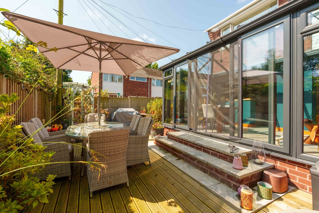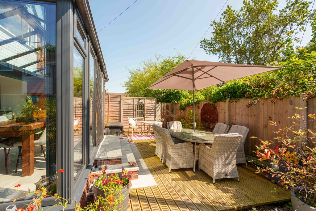 Externally, the property has a wrap-around garden that gets sun all day long. The garden is low-maintenance, being part decked and part gravelled, with multiple seating areas to enjoy the outside space. The property also comes with a sperate garage that has recently has a new door fitted.