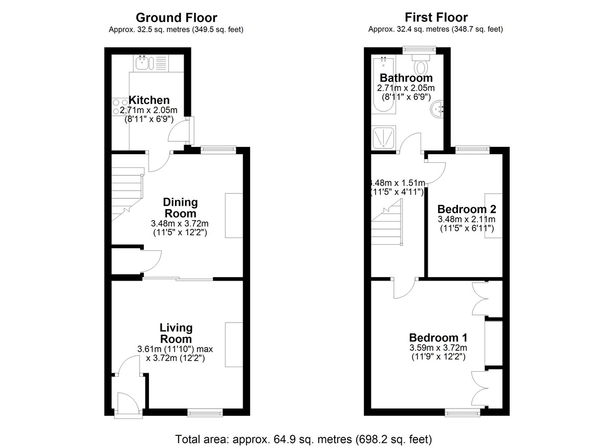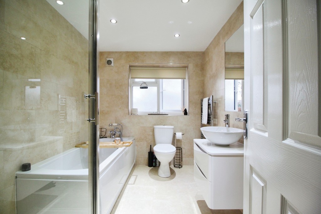 On the first floor, the property offers two double bedrooms, the larger of which is at the front and includes built-in wardrobes. The second bedroom overlooks the rear yard and is well proportioned. The bathroom features a bath, separate shower, heated towel rail, toilet, and sink.