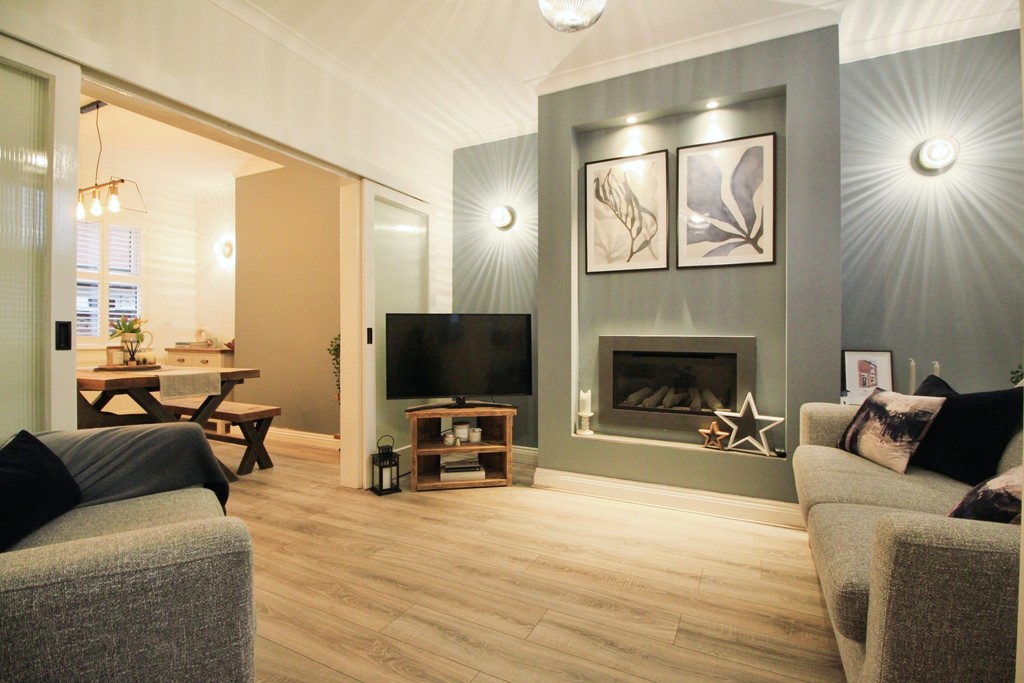 Upon entering through the front door, you are welcomed by an entrance vestibule, which leads to the open-plan lounge and dining area. The spacious reception rooms boast an open-plan layout but can be separated using sliding glass doors. The front room features a built-in electric fire, while the second reception room or dining room includes a staircase leading upstairs, with understairs storage. The kitchen, situated at the rear of the property, is equipped with shaker-style cupboards and high-quality appliances, including a fridge-freezer, gas hob, and washing machine.