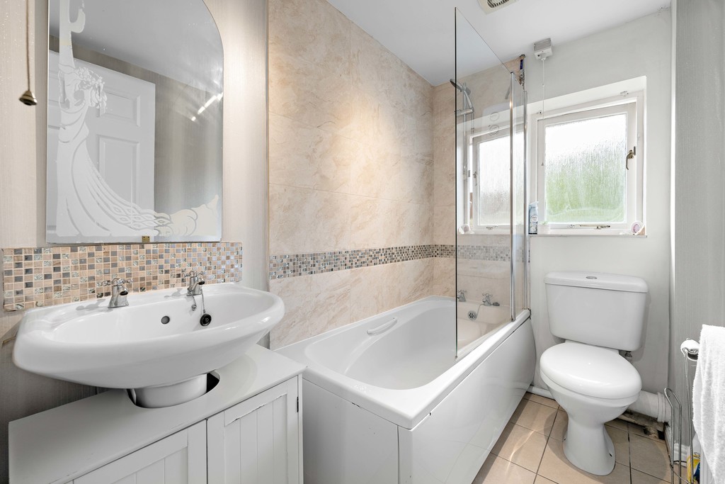 Upstairs, the property offers two generously sized bedrooms, each providing a calm and restful environment. Both rooms can easily accommodate double beds and additional furnishings, making them versatile for couples, children, or guests. The bathroom, conveniently located between the bedrooms, is well-appointed and designed to serve the household with ease.