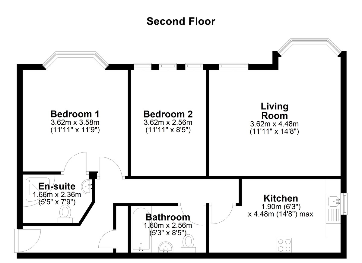 Both bedrooms are generous in size and benefit from fitted wardrobes, providing ample storage without compromising floor space. The master bedroom further benefits from a contemporary en suite shower room, while the second bedroom is served by a separate, well-finished family bathroom, making the layout ideal for guests or sharers.