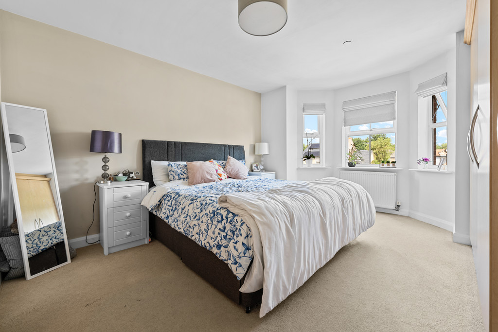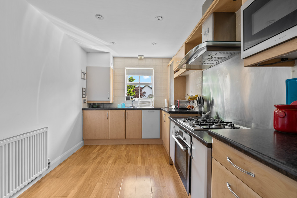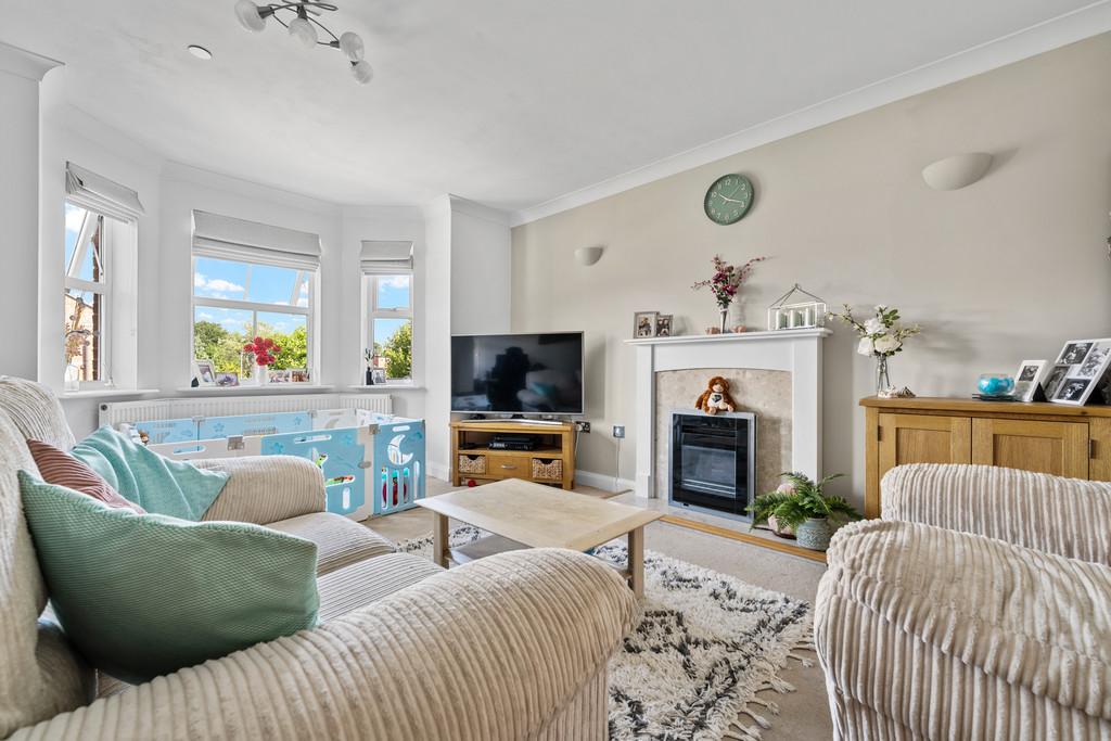 Inside, the property is thoughtfully designed and presented to a high standard. The large bay-fronted living room is a standout feature, filling the space with natural light and providing a charming view across the car park, making it an inviting place to relax or entertain. The separate kitchen is fitted with a range of oak-effect wall and base units and includes a variety of integrated appliances, offering a practical and stylish workspace for everyday cooking.