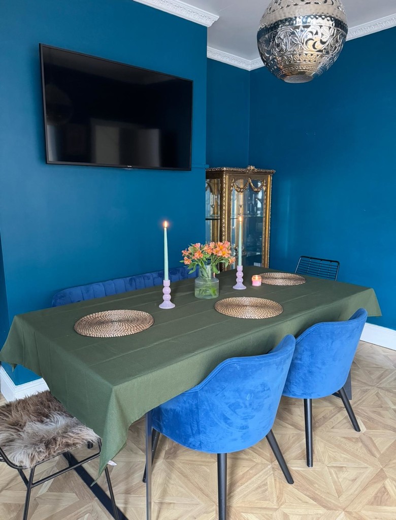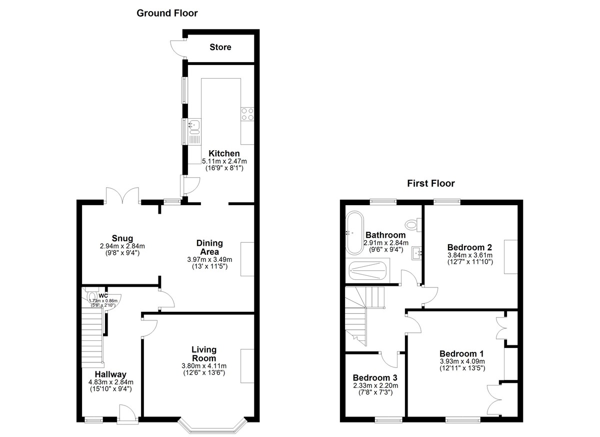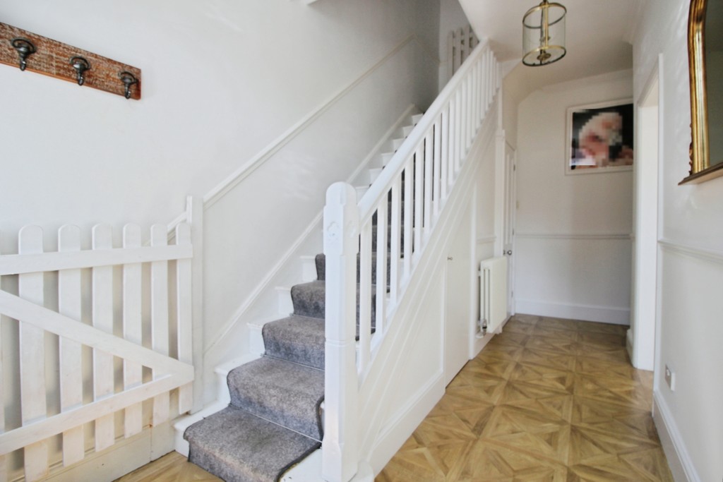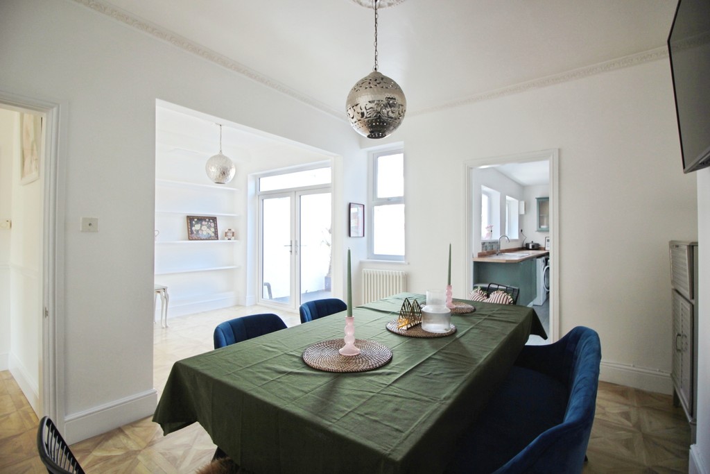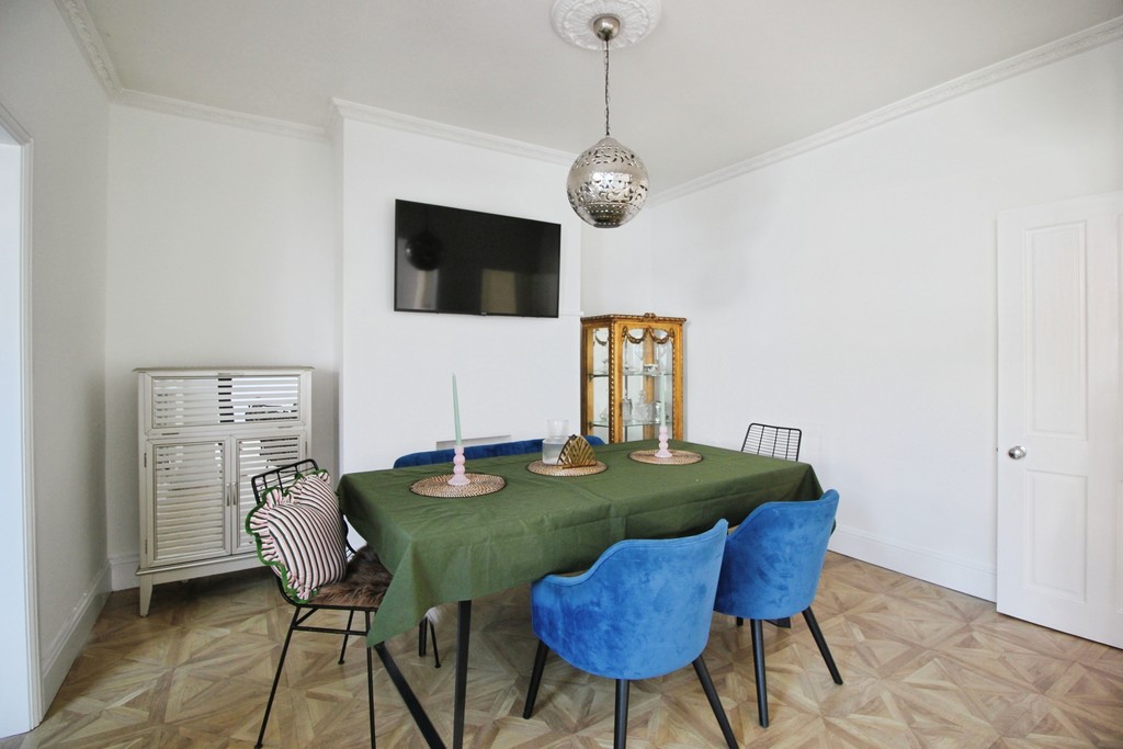 The property is approached via a walled front garden with a wrought iron gate leading to a tiled Victorian-style path up to the front door. Upon entering, you are welcomed into a hallway with parquet-style flooring and a staircase featuring the original balustrade. Leading off the hallway is a glorious bay-fronted living room with a high ceiling, decorative coving, an open fireplace, built-in shelving, and plantation shutters, creating a charming and inviting atmosphere. The hallway continues through to an open-plan dining room leading into a snug, offering ample space for family life or entertaining. The snug area features French doors opening onto the rear courtyard. At the rear of the ground floor is the fabulous kitchen, comprising shaker-style cupboards complemented by solid oak worktops, providing ample storage and workspace. In terms of appliances, there is a gas hob, an electric oven, and space for a dishwasher, washing machine, tumble dryer, and fridge freezer. The understairs space has been cleverly transformed into a well-designed downstairs toilet with a WC, vanity sink, and heated towel rail. There is also a great storage space under the stairs.