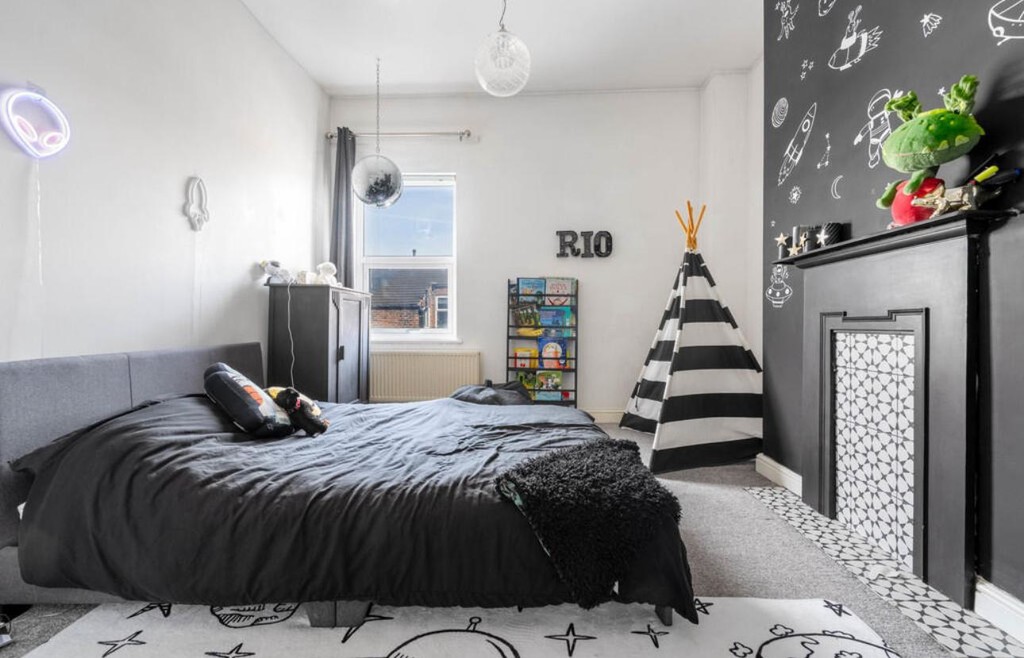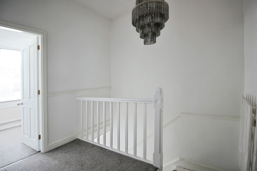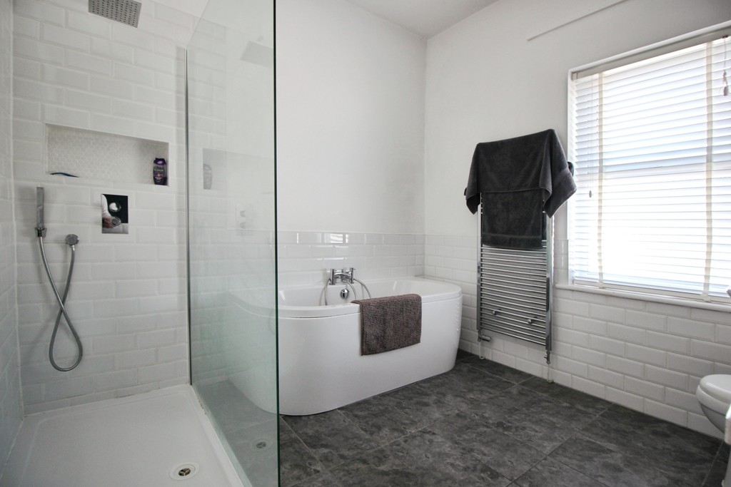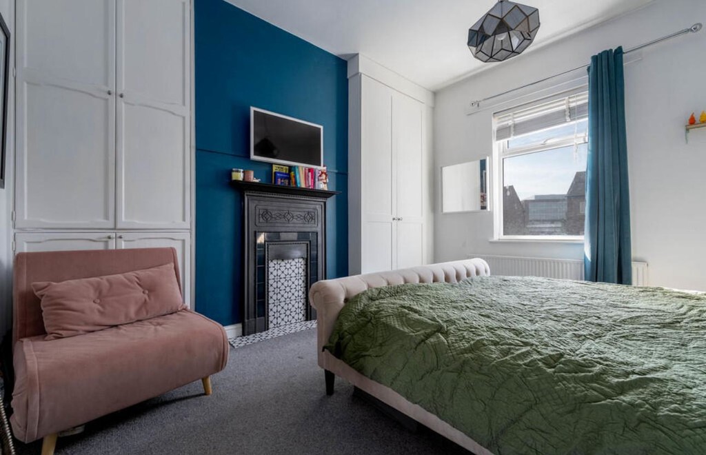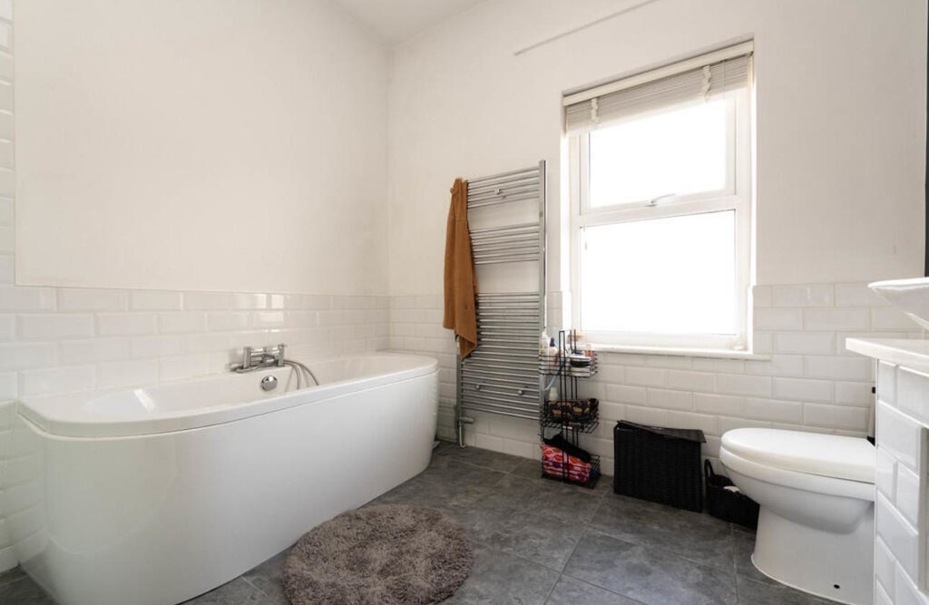 A spindled staircase leads up to a spacious landing, with doors opening to the bedrooms and bathroom. The first bedroom, located at the front of the property overlooking Lightfoot Street, is generously sized, featuring a high ceiling, a cast-iron feature fireplace with a tiled surround, and two fitted wardrobes that fit neatly into the chimney breast recesses. The second bedroom is another large double room, also featuring a cast-iron fireplace and overlooking the rear courtyard. The third bedroom, while able to accommodate a double bed, would also make an excellent dressing room or home office. The three bedrooms are served by a fantastic four-piece bathroom suite with tiled walls and flooring, comprising a luxurious oval-shaped bath, a large walk-in rain shower, a toilet, a sink, and a heated towel rail. There is loft access of the landing with a pull down ladder taking you to a boarded out loft space.