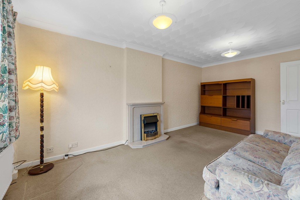 Inside, the porch has doors leading to the living room or the kitchen. The living room is a spacious, light-filled room with a curved bay window to the front elevation. The kitchen is fitted with a range of base and wall units, a one-and-a-half-bowl sink, a freestanding cooker, and spaces for appliances. The kitchen also houses the property's boiler.