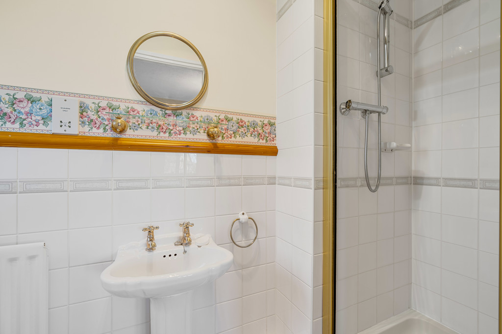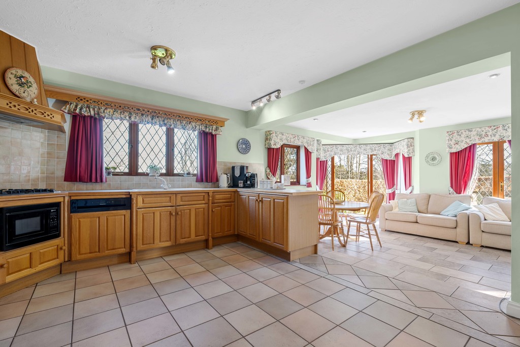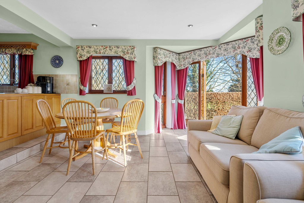 The kitchen diner is the true heart of the home, thoughtfully designed with distinct cooking and dining areas, separated by a small step to create a subtle split level. The tiled flooring flows throughout, complementing the handmade solid wood cabinetry and high-quality worktops. A range of integrated appliances includes a fridge-freezer, gas hob, microwave, dishwasher, and double oven. Large windows overlook the beautifully maintained garden, while two sets of French doors provide seamless access to the outdoor space.