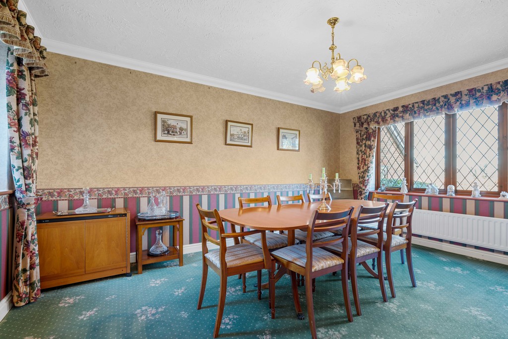 Leading back through the hallway, the property offers a separate utility room with designated space for a washing machine and tumble dryer, additional storage, and housing for the boiler, as well as a convenient rear entrance. Adjacent to this, a spacious dining room-currently arranged as a formal dining space-could easily be repurposed as a second living room or playroom. At the opposite end of the ground floor, a fully fitted office features bespoke solid wood shelving and cabinetry. Completing the downstairs accommodation is a cloakroom and a separate shoe and coat cupboard.