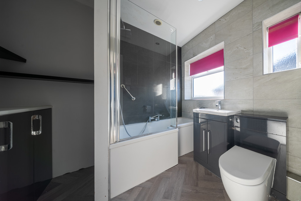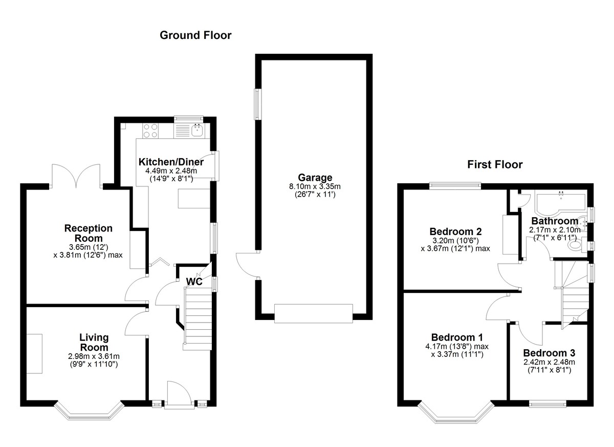 Upstairs, the principal bedroom sits to the front of the property and enjoys a bay window and feature marble fireplace, while the second bedroom is a well-proportioned double overlooking the garden. The third bedroom offers flexibility as a single bedroom, home office or dressing room. A family bathroom completes the accommodation, fitted with a P-shaped bath with shower over, WC and wash basin.