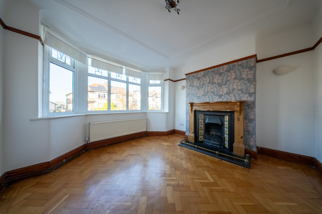 The property is approached via a driveway and paved front garden, leading to the front entrance which opens into a welcoming hallway featuring original parquet flooring that continues into the elegant bay-fronted living room, complete with a feature cast iron fireplace.