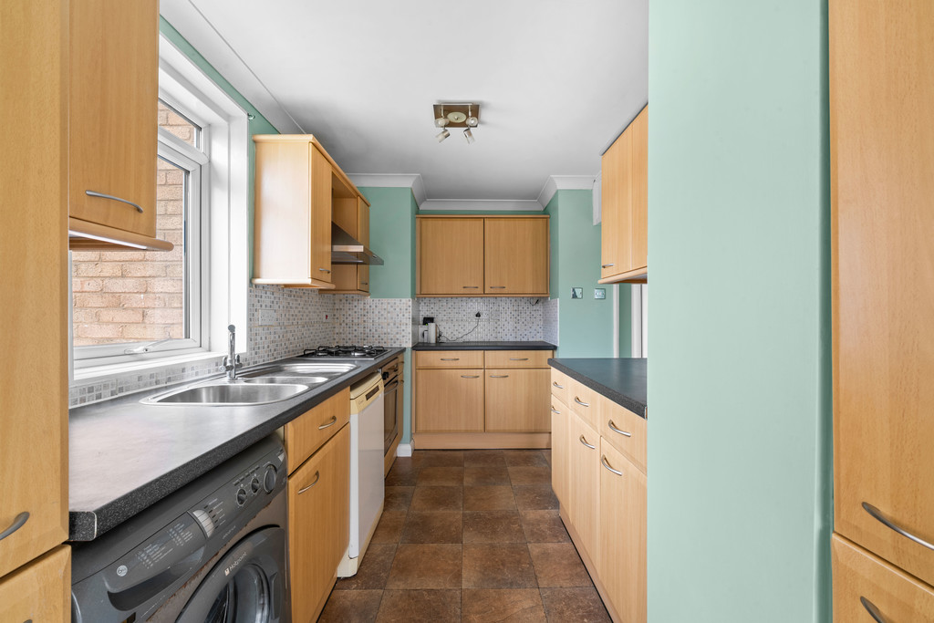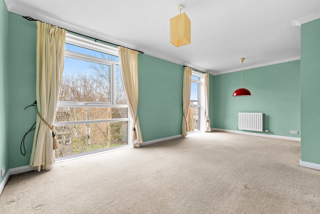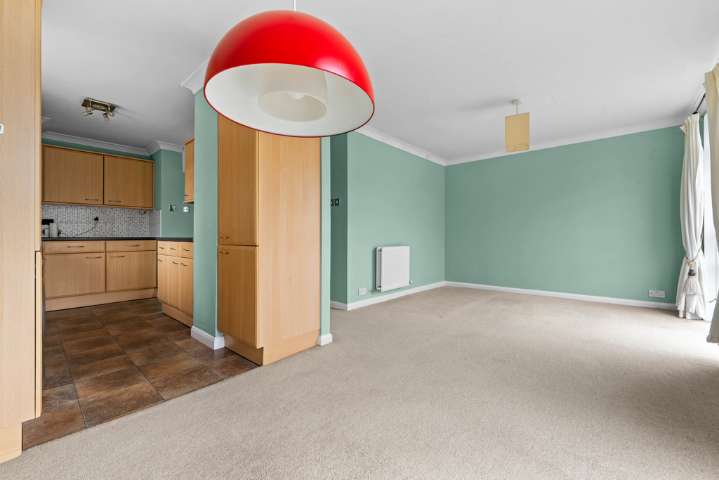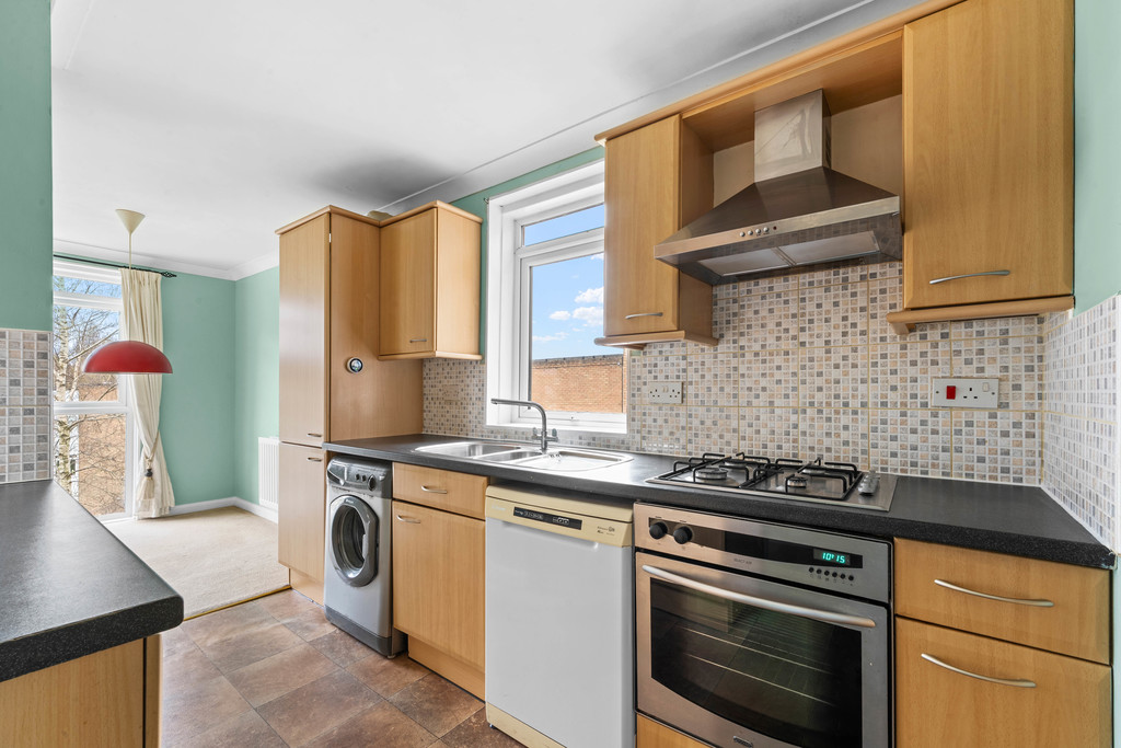 The accommodation has been thoughtfully maintained and improved, including recently installed uPVC double glazing and gas fired central heating. The fitted kitchen is well equipped with a gas hob, oven, integrated fridge freezer, alongside space for freestanding appliances including a dishwasher and washing machine. This opens into a bright and spacious living and dining area, enhanced by large floor to ceiling windows that provide an abundance of natural light and pleasant views over the communal gardens.
