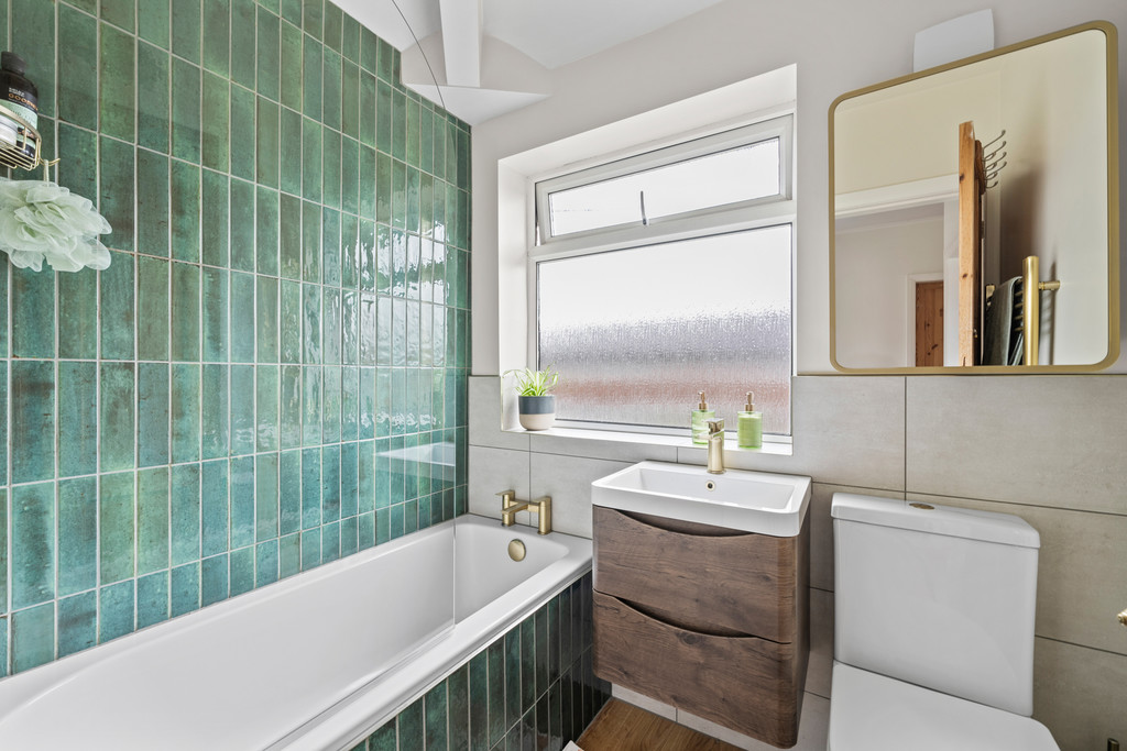 Upstairs, the home offers three well-proportioned bedrooms. The principal bedroom is a generous double, filled with natural light, while the second bedroom is another well-proportioned double room with a fitted wardrobe. The third bedroom is perfect for a child's room or home office. The contemporary family bathroom is fully tiled and equipped with a modern suite including a bath with overhead shower, wash basin, and WC.