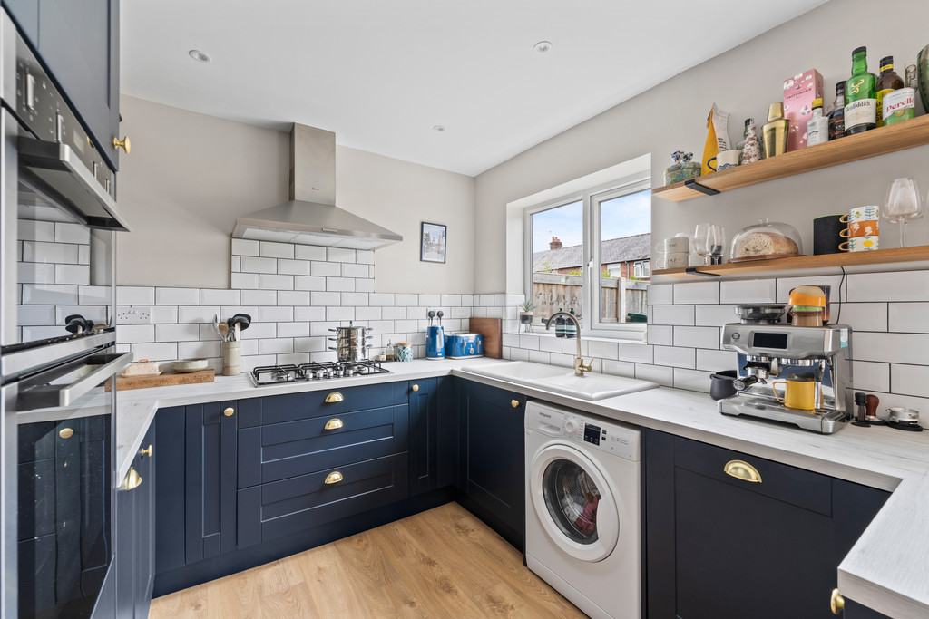 On entering the property, you walk inside to a hallway that leads into a bright and spacious living room, tastefully finished in a calming neutral décor that enhances the natural light and features a fabulous log burning stove. This welcoming space flows seamlessly into a modern open-plan kitchen and dining area, creating the perfect hub for everyday family life. The kitchen features sleek midnight blue shaker style cabinetry, integrated appliances, and generous workspace, with French doors opening directly onto a private, enclosed rear garden. The garden offers both lawn and patio areas, providing an ideal setting for summer barbecues, children's play, or simply relaxing outdoors.
