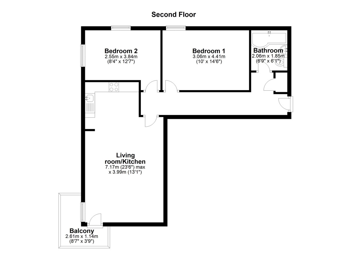 Upon entering, you are welcomed by a spacious hallway with a useful storage cupboard. The open-plan living area forms the heart of the home, perfectly suited to modern living and entertaining. The kitchen features oak-effect cabinetry with integrated appliances for a sleek finish, flowing seamlessly into the living/dining area. This bright, airy space is enhanced by large windows and a glass door opening onto an L-shaped balcony, which wraps around the living room and provides scenic river views with space for seating.