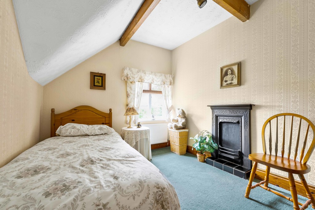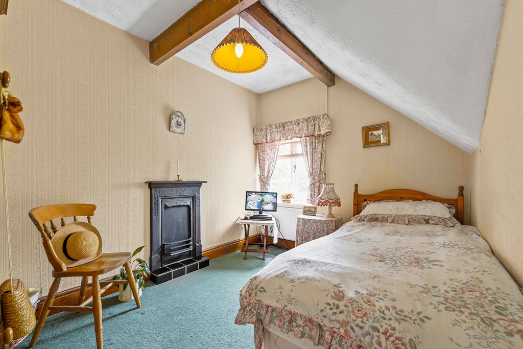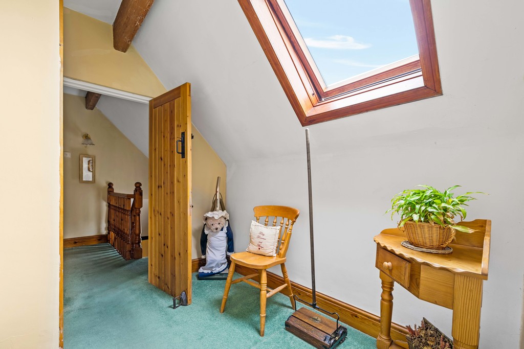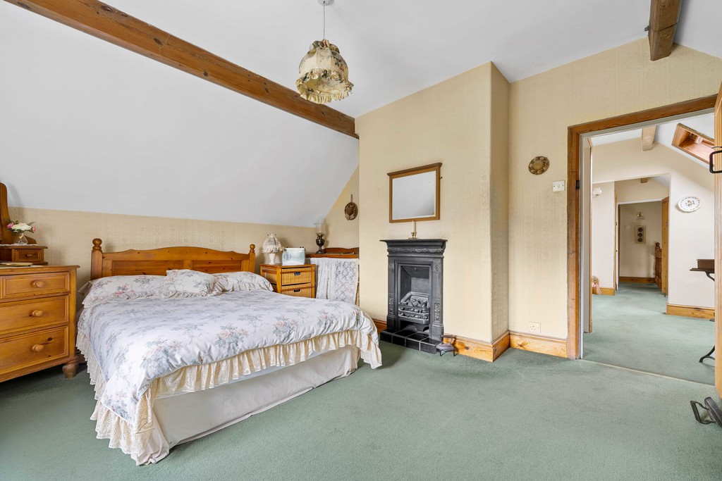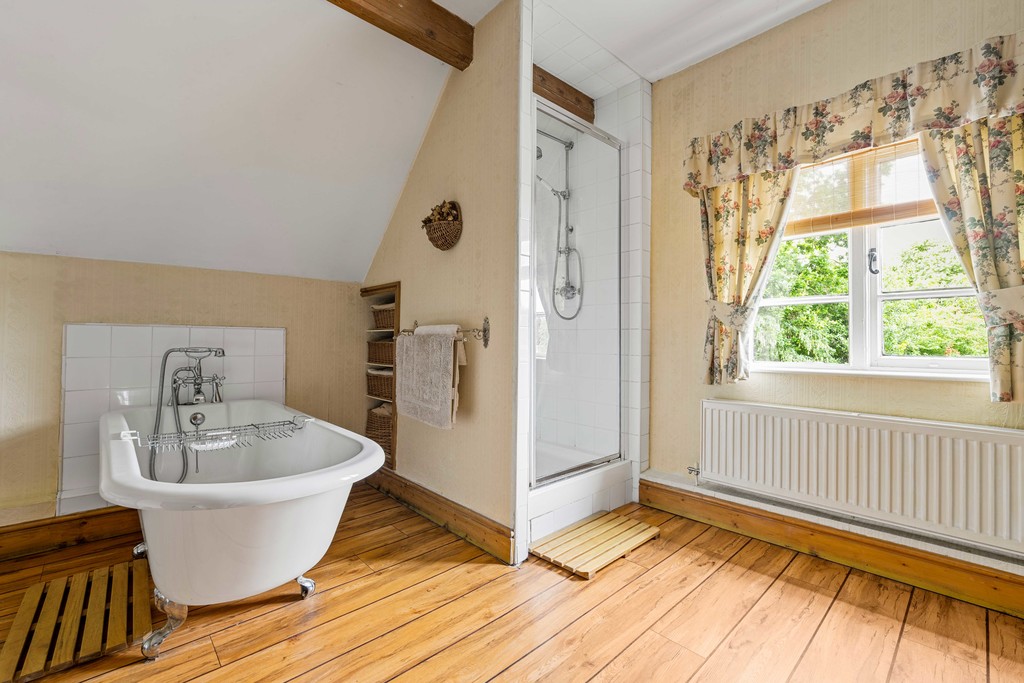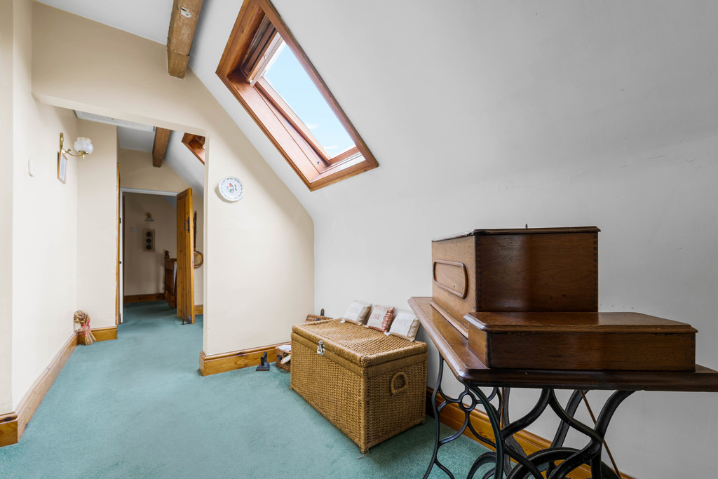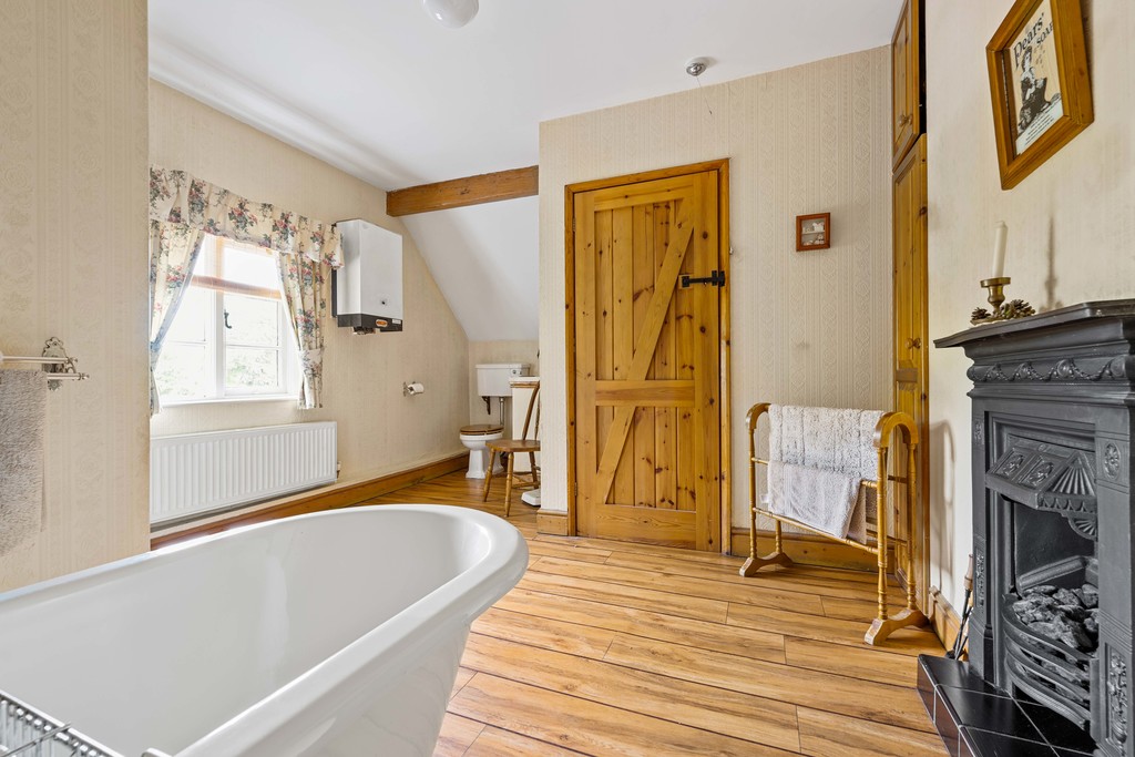 Upstairs, a spacious corridor-style landing with Velux windows fills the space with natural light. The master bedroom, located at the rear, is a generous double with a vaulted ceiling, fitted wardrobes, and views over the cottage garden. Two further bedrooms, similar in size, each feature cast iron fireplaces. A large four-piece family bathroom serves all three bedrooms, complete with a roll-top bath, separate shower, WC, and sink.