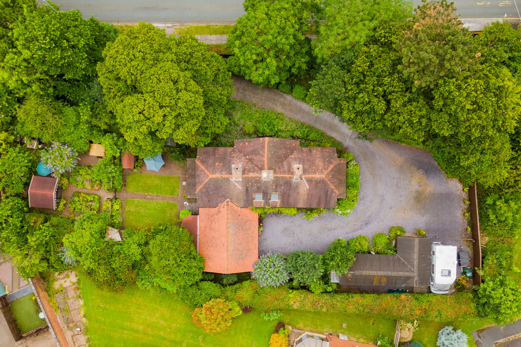 Accessed via a U-shaped cobbled-effect driveway off Saughall Road, the home offers three entrances: two porches on the east and west sides and a rear entry beside the main garage.