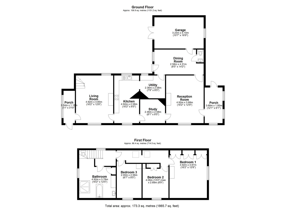 Upon entering, the first porch leads into the living room, where an original Victorian fireplace houses a remote-controlled gas fire. Next is the farmhouse-style kitchen, featuring handmade pine cupboards and tiled work surfaces. From here, two doorways lead to a utility room on the left and a study on the right. Toward the rear of the ground floor, you'll find an additional living room with a feature fireplace, a dining room, and a downstairs WC with a wash basin. Throughout the home, exposed timber ceiling beams and handmade ledge-and-brace farmhouse doors add to its rustic charm.