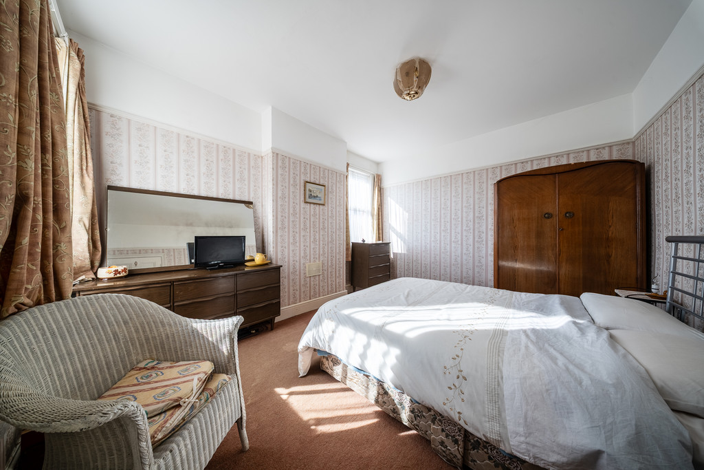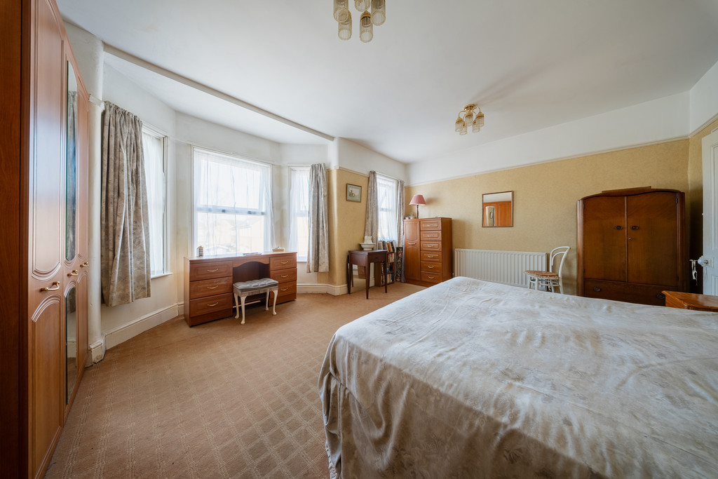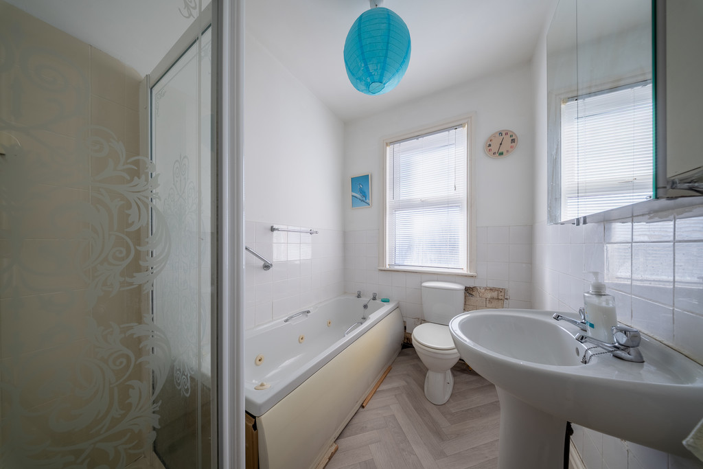A striking original Edwardian staircase leads to the first floor. The principal bedroom spans the full width of the property and features a large bay window, creating a light and spacious main bedroom. The second bedroom is a generous double with two windows, while the third bedroom is also a double overlooking the rear courtyard. The family bathroom comprises a four-piece suite including bath, separate shower, WC and wash basin.