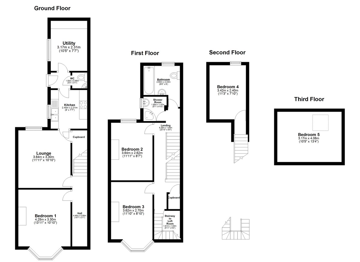 The first floor comprises two further well-sized bedrooms, a bathroom with bath, shower, toilet, and sink, plus an additional shower room with its own sink. The top floor houses the remaining two bedrooms, both equally spacious and bright.